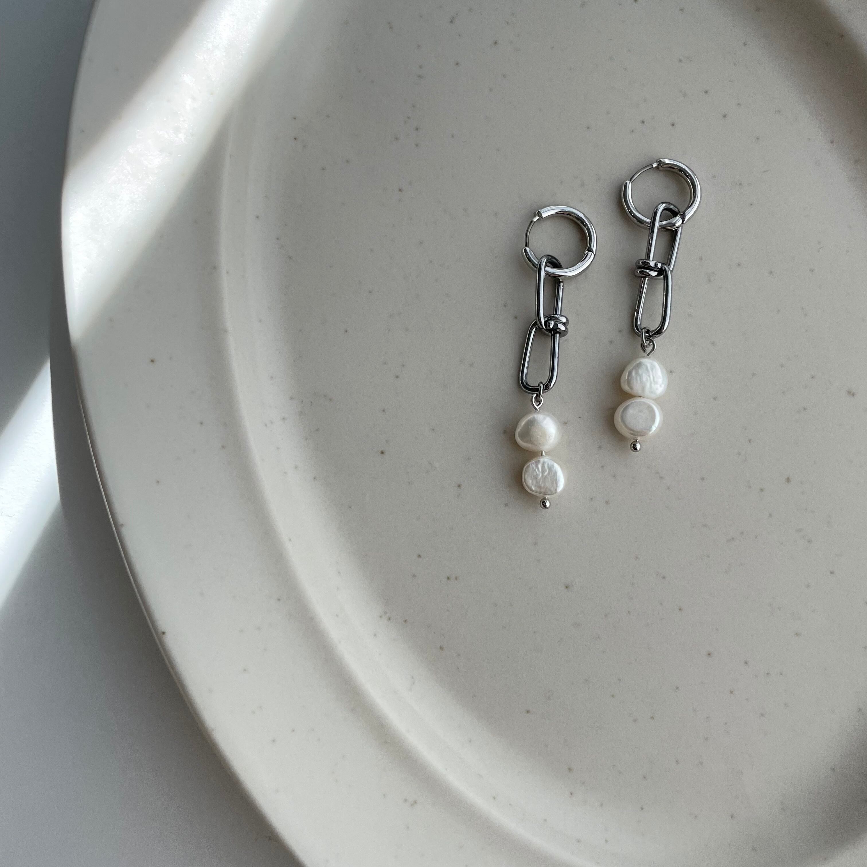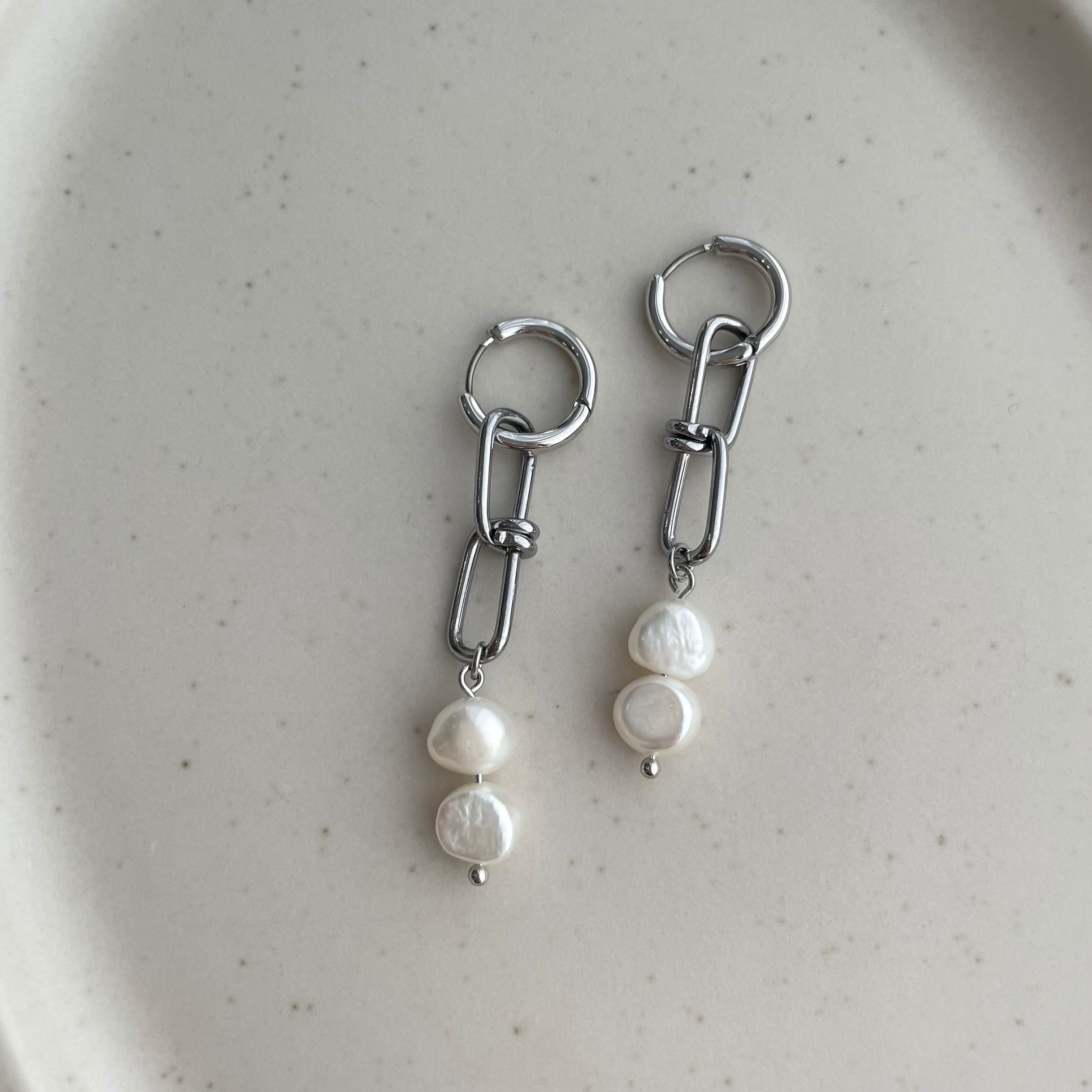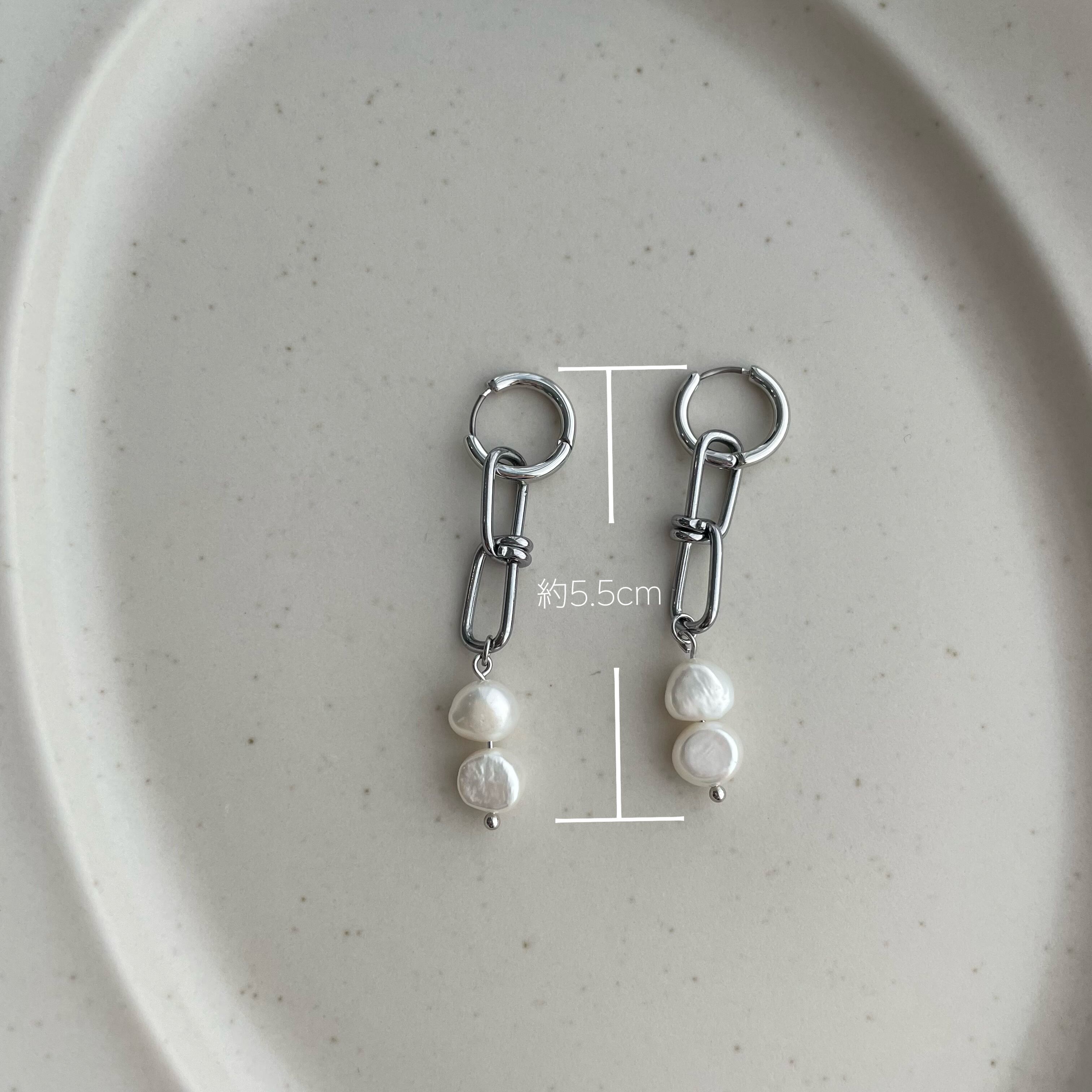淡水パールとステンレスチェーンのフープピアスです。